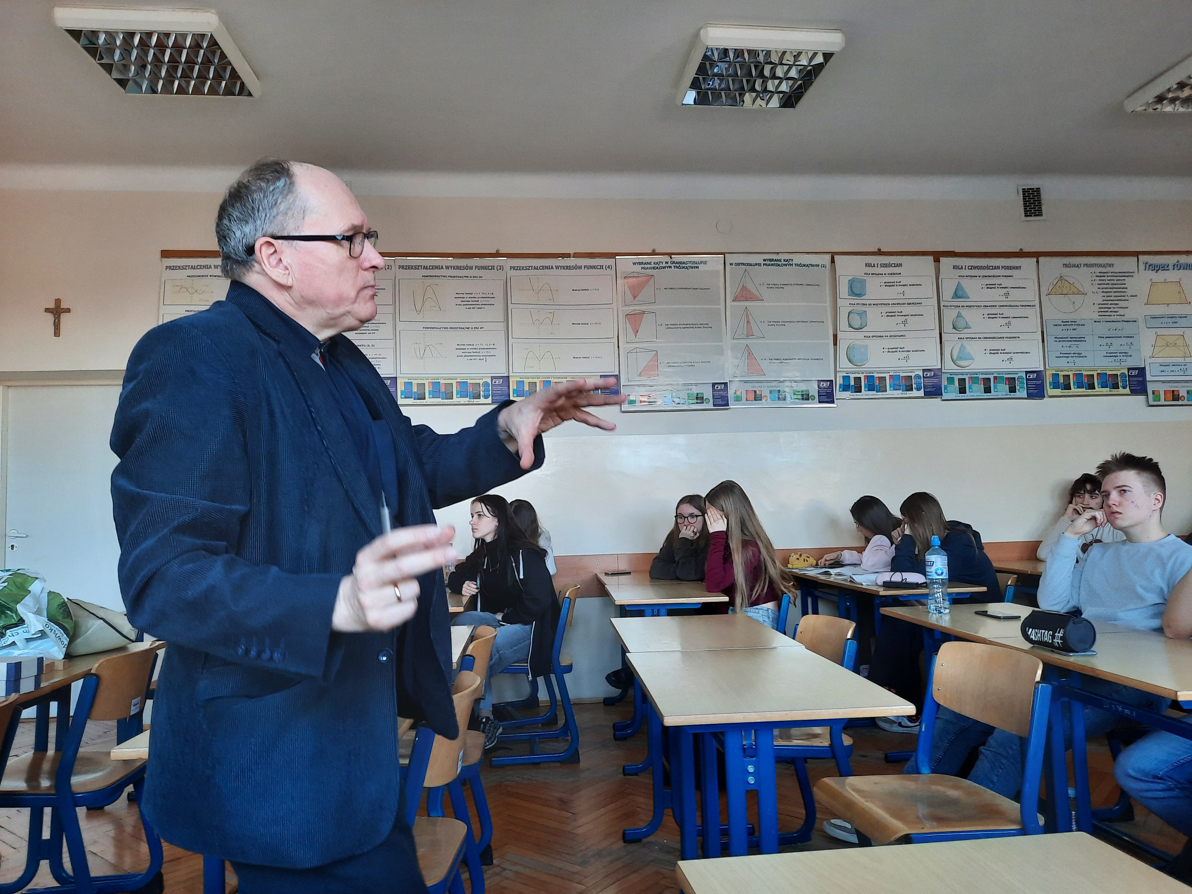 W dniu 15 grudnia 2025 naszą szkołę odwiedził Pan dr Andrzej Lenarcik z Politechniki Świętokrzyskiej. Po części wstępnej, związanej z Maratonem Matematycznym, odbyły się trzy dwugodzinne spotkania wykładowo-warsztatowe dla młodzieży