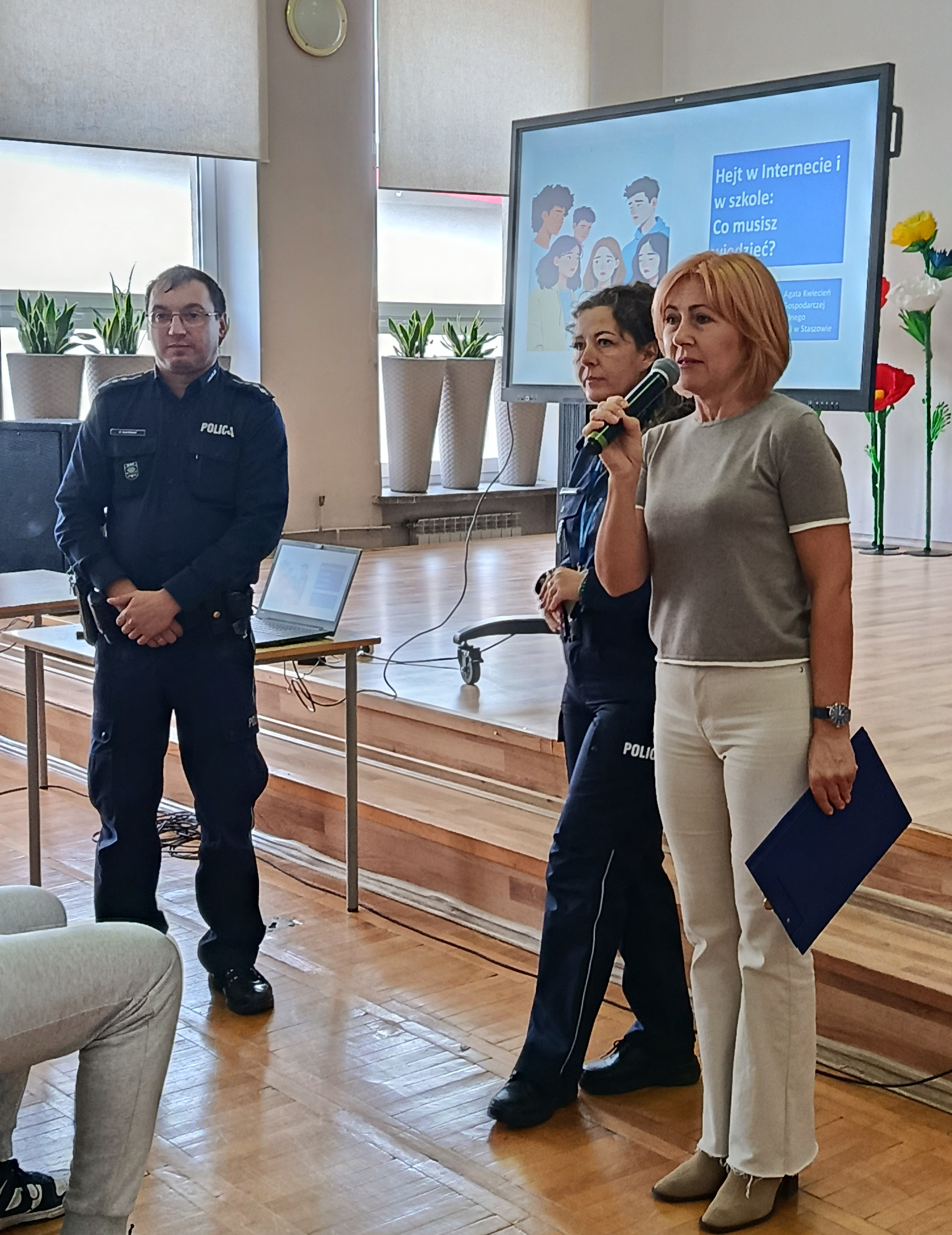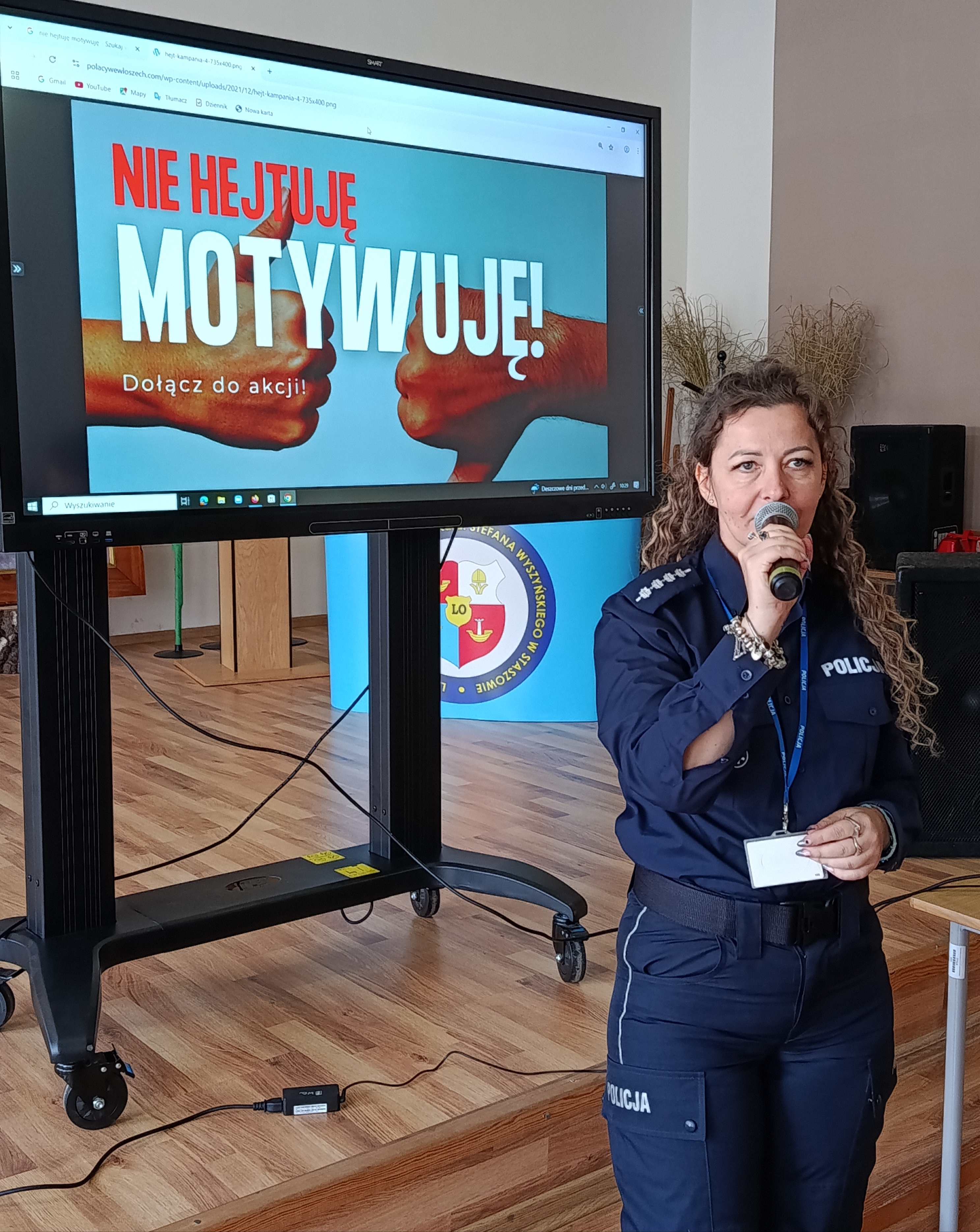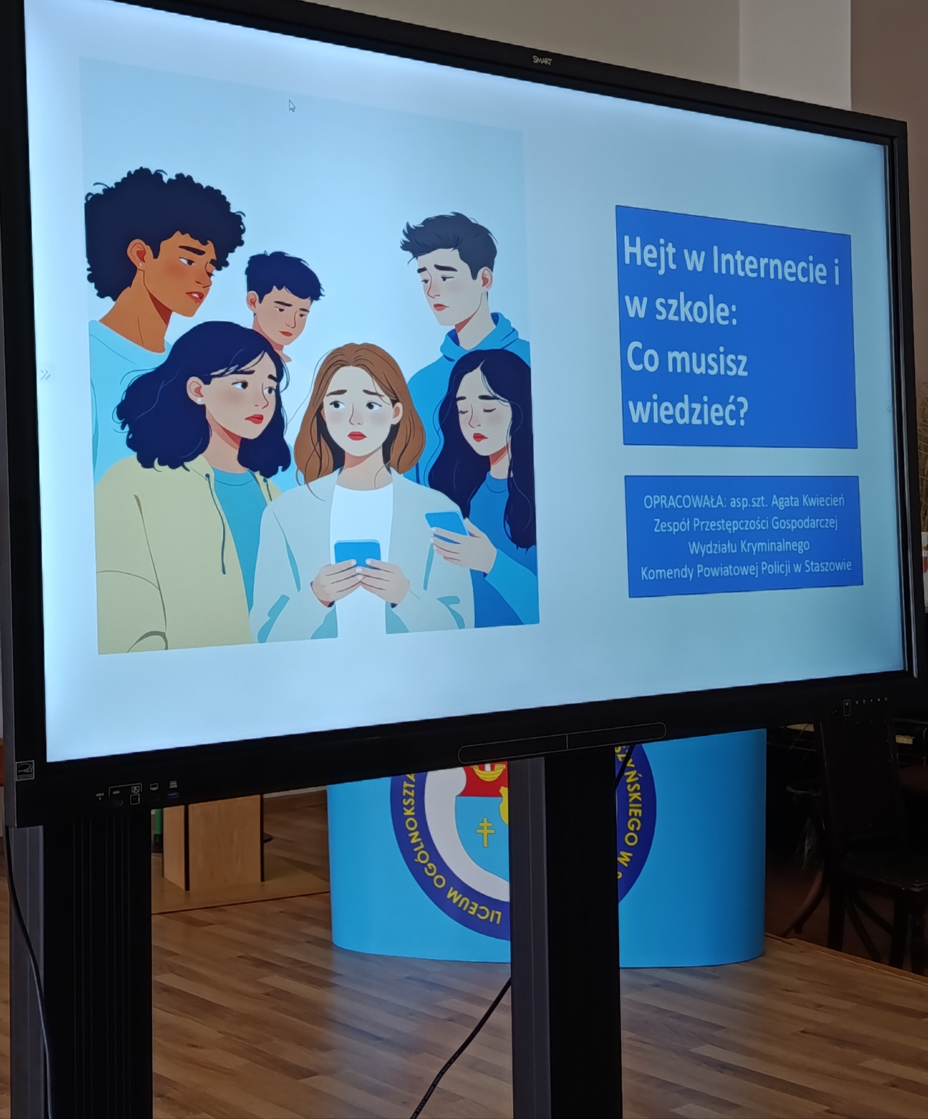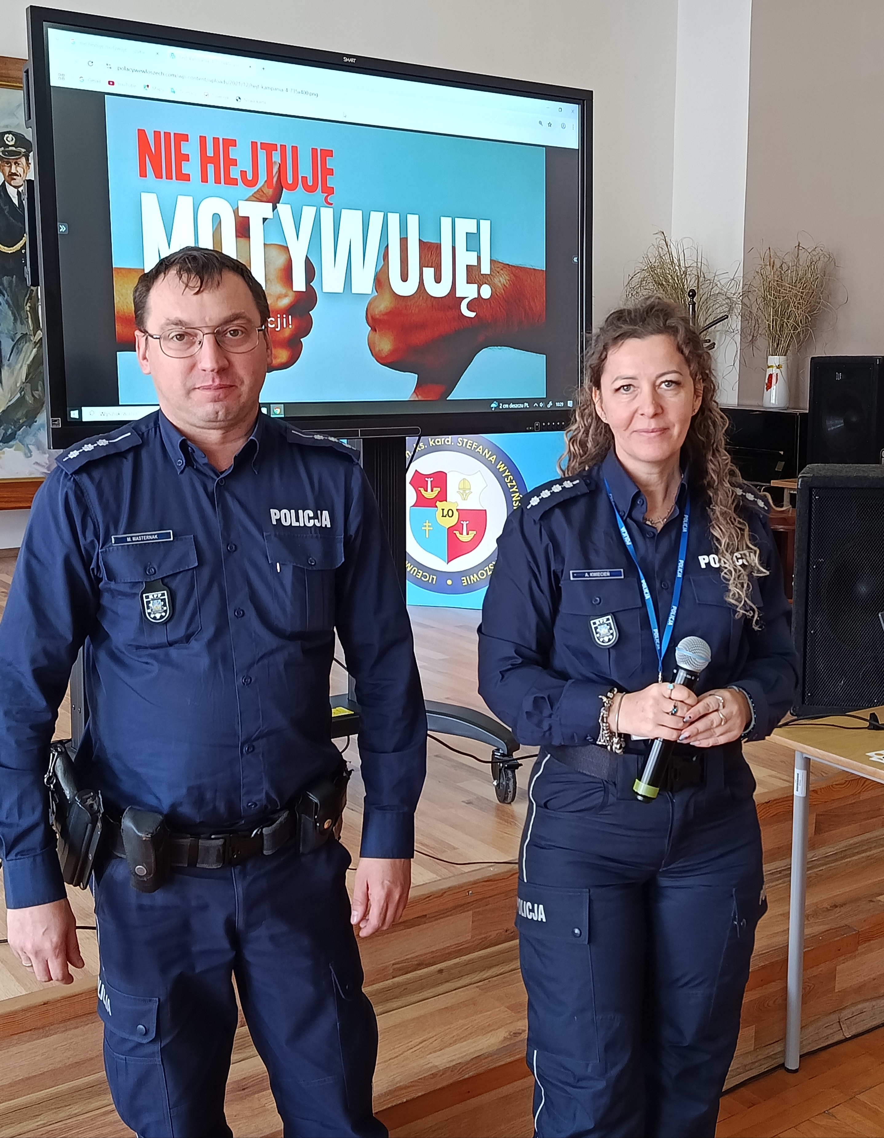 W ramach kampanii społecznej „NIE HEJTUJĘ-MOTYWUJĘ”, młodzież naszej szkoły uczestniczyła w prelekcji, której celem było zwrócenie uwagi na zjawisko cyberprzemocy rówieśniczej, hejtu i mowy nienawiści. W związku z tym w murach naszej szkoły gościliśmy funkcjonariuszy z KPP w Staszowie w osobach: asp. szt. Agatę Kwiecień i st. asp. Marcina Masternaka. W tym gronie, po raz kolejny, rozważaliśmy kwestię bezpieczeństwa w cyberprzestrzeni, która aktualnie jest wirtualnym środowiskiem funkcjonowania młodzieży. Funkcjonariusze Policji, poruszyli również kwestię bezpiecznego dostępu młodzieży do zasobów internetowych oraz starali się wzbudzić czujność młodych słuchaczy w kierunku ochrony informacji, urządzeń i zasobów cyfrowych.